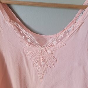 Soft pink vintage tank. Woven viscose rayon material, with a lace embroidered mesh applique around the neckline.