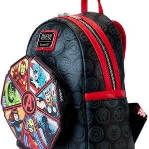 Get ready to show off your love for the Avengers with this Loungefly mini-backpack. The backpack features a glow-in-the-dark design that showcases your favorite Marvel characters. The red handle and straps add a pop of color to the black exterior, while the multicolor lining ensures a comfortable and spacious interior. Perfect for any fan of the Avengers, this backpack is made of durable polyurethane material and is ideal for everyday use. Whether you're heading to work or out for a day with friends, this mini-backpack is the perfect accessory to complete your outfit. Join the celebration of the Avengers' 60th anniversary with this stylish and functional backpack.