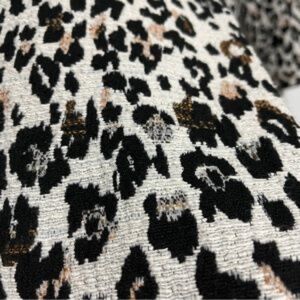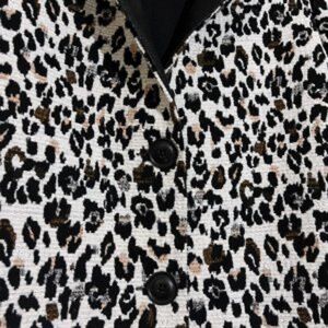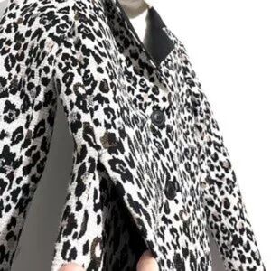 In excellent preowned condition. Faux leather at collar. Textured weave with multi-color leopard print and some metallic threads. Three-button closure. Slit pocket at the hip.