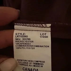 This beautiful LeChateau plum shade with black lace on chest and neck has a peplum bottom. The zipper is in the back with a peep hole and a chiffon tie
