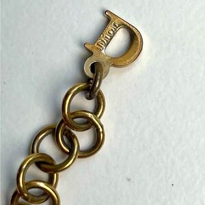 This is a sweet gold-tone Dior necklace with two pendants - one says Dior and one is a flower with small crystals (all stones present). A little tarnish on the links and feather scratches on the Dior pendant. Measures 17”. Please see all photos and videos. Comes with COA,. All sales final.