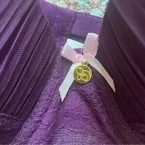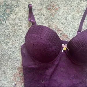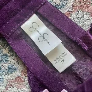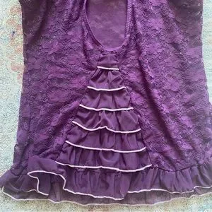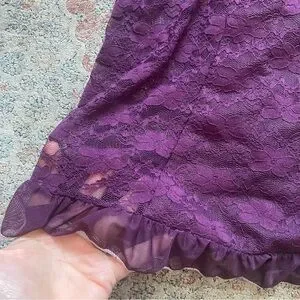 Sweet and romantic. Sheer lace, with tiered back ruffle panel, and ruched & textured cups. Adjustable straps. Rich purple color. Size 2X. Polyester/spandex/nylon.