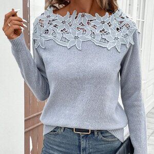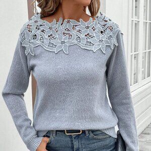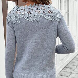 Grey Casual Women's Lace Patchwork Crew Neck Pullover Sweater
