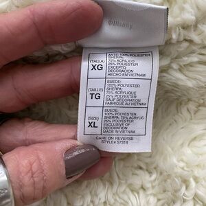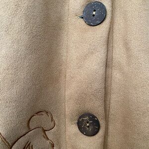 This listing is for a vintage Y2K Disney Tinkerbell jacket in a size XL. Suede, Sherpa lined, coconut buttons. Large Tink embroidered on front. Sherpa inside and along sleeves and bottom. Measures approximately 23” from pit to pit and 30” long from shoulder seam to hem. Super cute, barely worn, excellent condition. M-91-0/B