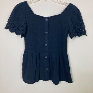 Madewell Top Womens XS Eyelet-Sleeve Lucie Smocked Peplum Black NE241