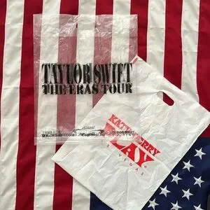 Two plastic merch bags from T.Swift’s Eras tour and two bags from Katy Perry’s Vegas residency. Taylor Swift bags are clear plastic w black lettering and Katy Perry bags are white plastic w red lettering. One Disneyland (DisneyParks) plastic bag. No actual merch included 😝. 6 plastic bags in total, all in one package. And one Beyonce Cowboy Carter handtag from her concert. And two jelly belly bags with Las Vegas pen. Sold as one bundle of bags. (“Taylor’s Version shirt sold separately.)