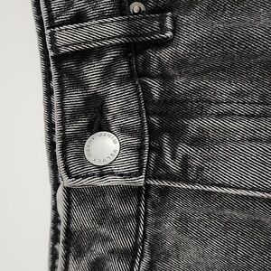 Midi skirt features an above-knee length at the front and slightly longer length at the back. This five-pocket piece comes in black overdyed black and dark grey wash.