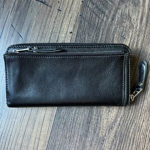 12 credit card slots, interior zip pocket, 2 interior cash compartments, and back zip compartment