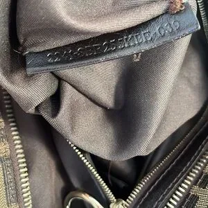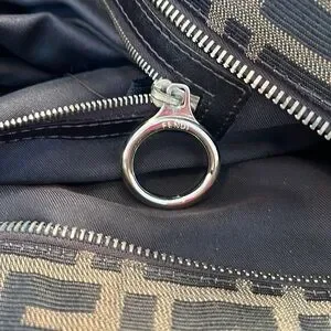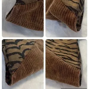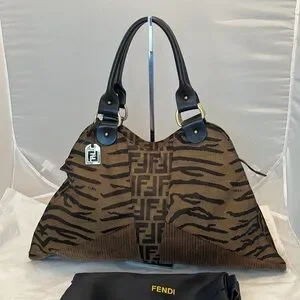 Authentic, Fendi Devil Trapezio handbag. This jumbo sized bag is done in a triangular shape, with Fendi logo Zucca canvas and corduroy base and corners. Leather wrapped rolled handles. Top zip. Hanging Fendi bag charm. All golden hardware with Fendi logo printed throughout. Inside nylon lining has one zipped pocket. Canvas in excellent condition with no tears, stains, holes or pulls. Corners show no wear, no fraying, no bald spots. Leather handles show zero to no wear or scratches. Handle hardware has small scratches from friction. Zipper pull also has small scratches. All very minimal. Bag was hardly used and is in beautiful condition. Soft, pliable and very comfortable when worn. Generously sized to fit all essentials and more. Includes Fendi dust bag. Guaranteed authentic. Made in Italy.