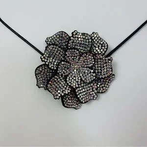 Elevate your accessory game with the masterpiece of versatile design. This piece features a captivating floral motif surrounded by a halo of sparkling crystals that mimic the night sky's stars. Fashioned with a black cord,this choker presents two chic wearing options—wear it as a classic choker that sits elegantly at your collar or experiment with an asymmetrical style for a modern, edgy vibe.