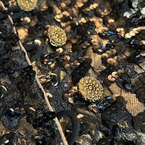 Beautiful black sequin fabric on top of gold Lame fabric, blazer is fully lined, beautiful gold ornate buttons, no flaws anywhere. Shoulder pads are attached, but can be easily removed. Tagged a vintage size 10, fits like a modern medium refer to measurements below. On size small model.