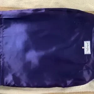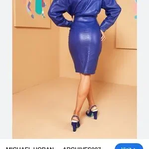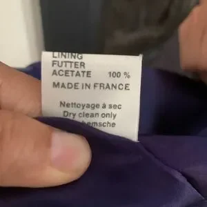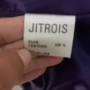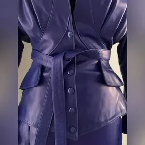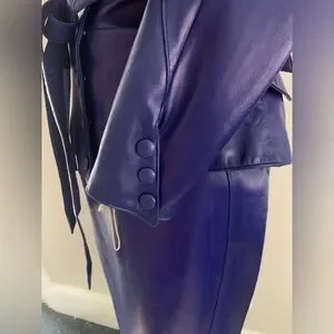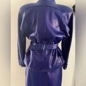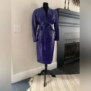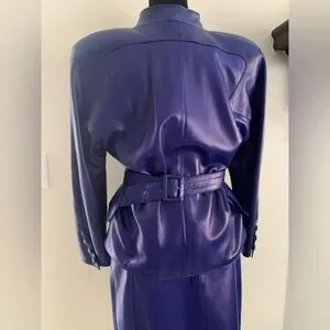 Iconic set in blue purple leather, Jean Claude Jitrois, belt at the back, straight skirt and fitted jacket, purple lining, skirt length 46.5 cm. Numbered tailor. Size not indicated but it is a size 42 fits like a small 4 -6 3 buttons on each sleeve. Back zip skirt. Worn twice.
