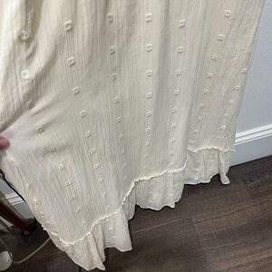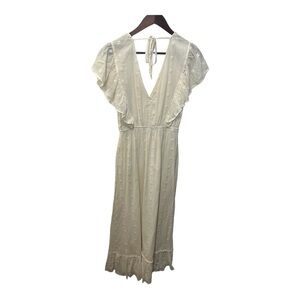 LOVE STITCH IVORY CREAM EMBROIDERED FLUTTER SLEEVE MAXI DRESS SIZE SMALL. ABSOLUTELY STUNNING PIECE! FEATURES BEAUTIFUL DELICATE DETAILS INCLUDING FLUTTER STYLE SLEEVES, EMBROIDERED DESIGN, DEEP V-NECKLINE WITH TIE DETAILS ON BACK NECKLINE. BEAUTIFUL LIGHT COTTON TEXTURE WITH INTERIOR LINED CRISP COTTON AS WELL. BOTTOM RUFFLE ACCENT. THIS DRESS GIVES DESIGNER VIBES SUCH AS ULLA JOHNSON OR DOEN! IT IS COTTAGECORE, PRAIRIE, WESTERN, ETC! THIS PIECE IS ALL ABOUT THE DETAILS! NOTE: ALONG RUFFLE SEAM AT BOTTOM ONE AREA NEEDS A SMALL STITCH. PLEASE SEE PHOTO. VERY MINOR. OTHERWISE, THIS DRESS IS GORGEOUS!