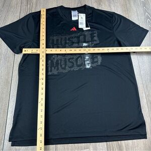 Get ready to hustle for the muscle with this Adidas Aeroready training shirt in size XL. The black jersey fabric is perfect for gym and training activities, and the short sleeve design provides comfort and flexibility during your workout. The shirt features the Adidas brand logo and the Hustle For The Muscle theme, making it a stylish addition to your activewear collection.