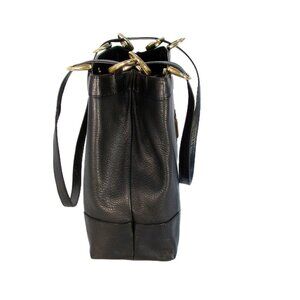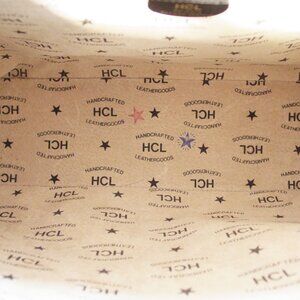 Beautifully-made structured tote by HCL, this handbag has a pebbled leather exterior with smooth leather trim. Genuine suede lining has the HCL classic silk-screened logo. Extra long leather shoulder strap is fed through multiple gold rings, adding to the luxurious look. Hardware is 24K gold-plated and looks it. Strap can convert to a crossbody style (but it's quite long for most people). Large main compartment with a zip pocket that can comfortably hold a cell phone. Bottom studs. Retail card from Rocket Retro included, marked at $185.