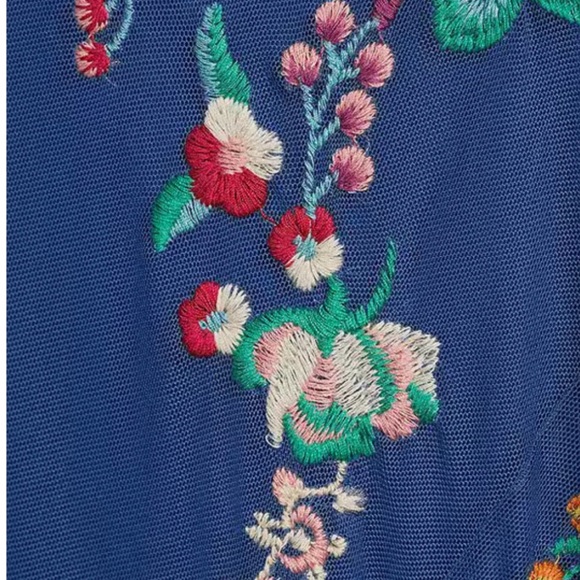 Johnny Was Mazzy v neck embroidered mesh maxi dress w separate under slip. Color dream blue. Good condition. NWT