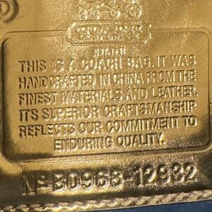 Handles and Straps: It comes with dual top handles for a classic satchel look, and an adjustable, detachable shoulder strap for hands-free convenience. The strap can be adjusted to different lengths, allowing you to wear the bag over your shoulder or across your body. Interior: Inside, the bag is lined with a soft fabric and includes various pockets for organization, such as a zippered pocket and slip pockets for smaller items like your phone and keys. Closure: The top of the bag features a secure zip closure to keep your items protected. Three leather Coach hangtags- 1 white, 2 metallic gold. Gold tone hardware.