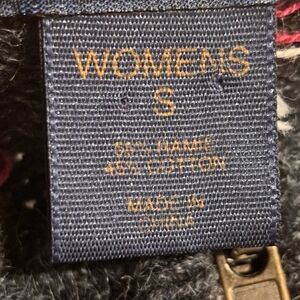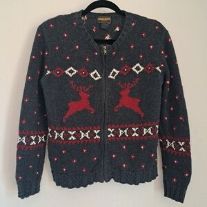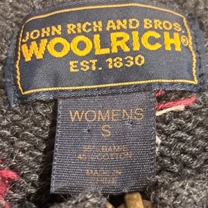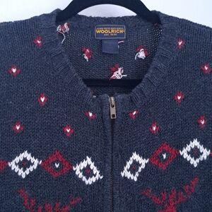Adorable Woolrich fair isle charcoal gray, red and white, full-zip sweater. Ramie/cotton blend. Approximate measurements are: 18.5 " armpit to armpit and 21" shoulder to hem. In very good preowned condition.