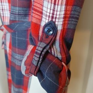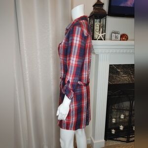 This Banana Republic classic plaid shirt dress will never go out of style. It looks like flannel but it's a lightweight soft fabric. The plaid pattern is in a color palette of red, navy blue and white. Button down front with removable waist tie belt.