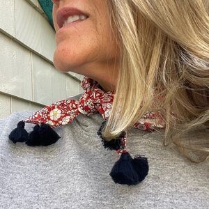 JCrew x LIBERTY of London June’s Meadow Tana Lawn tasseled bandana, 19”x19”. So cute and sporty!