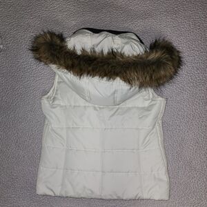 Cold Water Creek Beautiful , Soft , Comfortable White , Puffer , Faux Fur Vest Jacket . Excellent Condition ! Lots Of Trendy And Useful Silver Zip Pockets . Measurements 20 Inches Pit To Pit , Length Is 23 And A Half Inches . That Is With The Hood Attached . Size Small Or Size 8 .