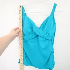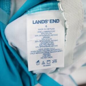 Make a stylish splash with the Lands End Aqua Blue Turquoise Twist Swim Tankini Top. This tankini top features a vibrant aqua blue turquoise color and a flattering twist detail at the front, adding a touch of elegance to your swimwear. Designed in size 6, it offers a comfortable and flattering fit. Please note that there is a tiny thread and a tiny area of thread missing on the inside, as shown in the photo. Despite these minor imperfections, the tankini top is new without tags, never worn or used, ready to enhance your beach or poolside look with its fashionable design.