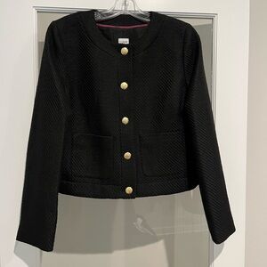 J CREW MERCANTILE TWEED LADY JACKET/BLAZER SIZE 8 IN BLACK. Long sleeves with Gold button front closure. Has 2 front pockets. Completely lined. Made of Polyester and Acrylic. Measures 20” shoulders to hem 19 1/2” armpit to armpit closed. NWT!