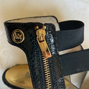Michael Michael Kors Meadow Strappy Pointed-Toe Pump Heels in black with gold accents. These heels feature a pointed toe, crisscross straps, and a stiletto heel.