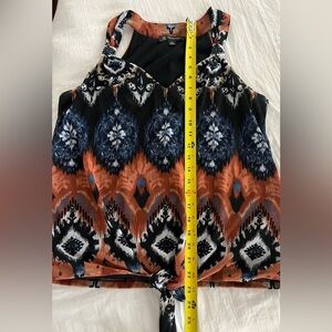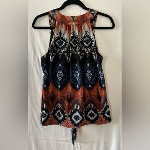 Lightweight halter style top with tie waist. Brown, blue and black pattern, excellent used condition.