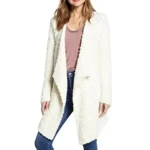 1. State Antique White Golden Hour Drape Front Cocoon Cardigan. Features a cozy soft, shaggy poodle texture, open front, draped lapels and long sleeves. Polyesters/acrylic blend.