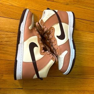 Brown and White Nike dunk highs in women’s size 8.5. Great condition/only worn 2-5 times.