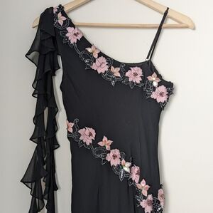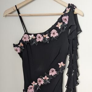 Vintage Cache Black Pink Silk Asymmetrical Floral Beaded Slip Dress