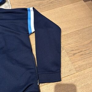 Navy Blue with Logo at chest and striped design on sleeves. Zippered pockets on sides and hood.