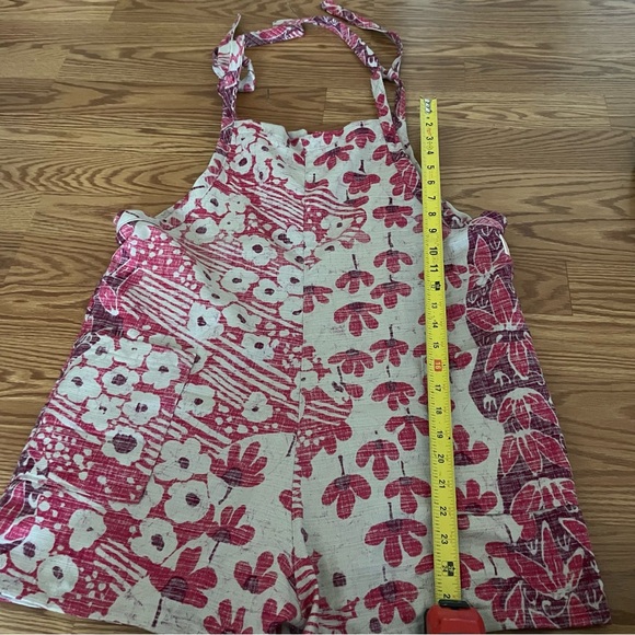 Repurposed fabric overalls with pockets and adjustable tie shoulder straps.