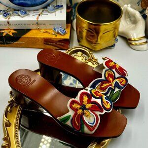 With a global mind-set, the Tory Burch woman is sophisticated and cultured with a soft spot for eclectic touches. These multicoloured leather Bianca sandals from Tory Burch feature a slip-on style, an open toe, a brand embossed insole, a low block heel, and scallop-edged leather with embroidered irises and colorful beads