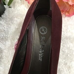 Fabulous Merlot colored genuine Suede pump. These shoes will be a staple for you. The silver details add just enough attention not to be garish. The 3β black block heel is also subtle and just makes the upper shoe even more beautiful πππ