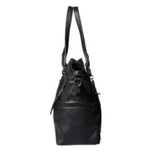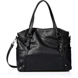 A sizable faux leather tote bag that features assorted interior pockets and studded exterior details that compliment a removable metal feather keychain.