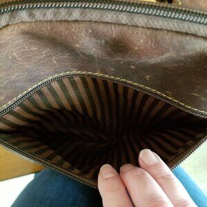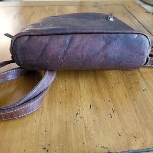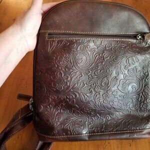 Pretty embossed dark brown leather satchel, backpack, purse, tote, sling bag, carry all bag.