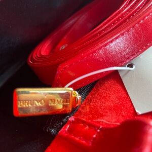 Bruno Magli red purse, NWT. Comes with dust bag, letter of authenticity. Was a present but I never used it. The only flaw is a dark spot on the inside side, (see picture). Has detachable strap. Opens wider on the bottom. Bought at Neiman Marcus