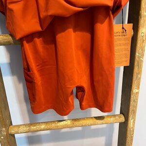 Love these workout dresses. 32” in length, 14” armpit to armpit but super stretchy. Shelf bra and shorts are connected. Shorts have a pocket on each leg. Size Small