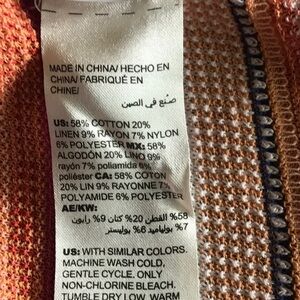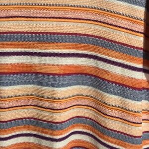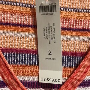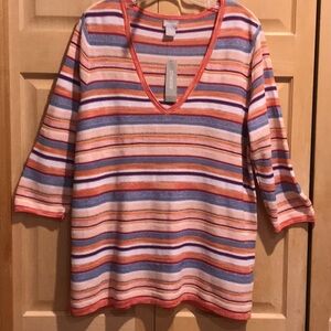 Chico’s 3/4 sleeve tunic top. Stretchy knit. Stripe design. Multi color - orange, white, blue, & maroon. V-neck. 4” slits bottom of sides.