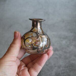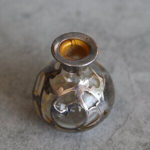 Measuring 2.5" tall and 2" in diameter at it's widest part. This little bottle is missing it's stopper, but it could easily be used purely for decorative purposes or as a tiny bud vase. It's just as sweet as can be with sterling silver overlay.