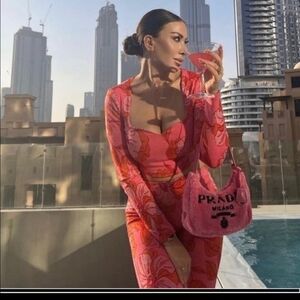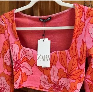 Zara Pink Orange Floral Print Jacquard Crop Top Pants 2 Piece Set small