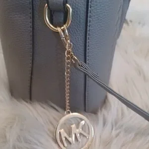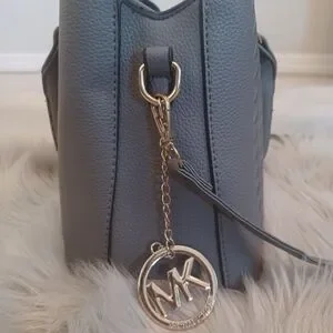 Interior has a center zippered pouch, side zippered pocket, and small open pocket. Bag has a zipper closure on top, double handles, and a removable cross-body strap. Purse chain charm included with a MK circle emblem.