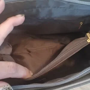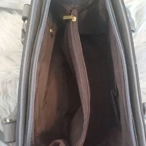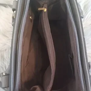 Beautiful gray faux leather satchel has lighter gray stitching designs on the front and goldtone hardware.