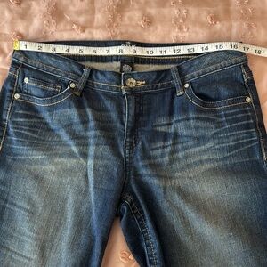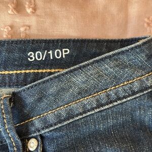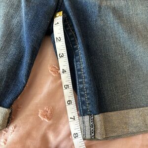 Lovely walking Bermuda Jean Schwartz with stretch in a 10 petite! In excellent pre-love condition. No longer fit me or I’d be keeping these little beauties! Has contrast acid wash finish and adorable embroidery stitch on back pockets which is what made me fall in love with these. Measurements included above to assist sizing