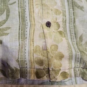 Tommy bahama yellow green foliage camp shirt button down collared one pocket on front. short sleeve.100% Linen. Great condition . No flaws looks new with our tags.