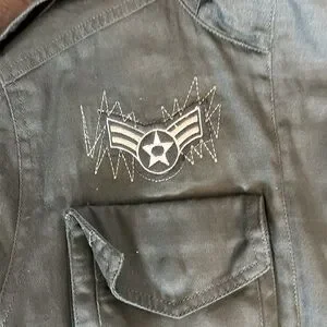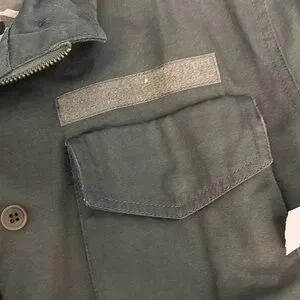 Unique army jacket feels has Velcro to place a name patch or patch of any sort. Patch is not there. Super cute detailed jacket string at inside waist which allows waist to be gathered.