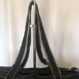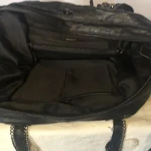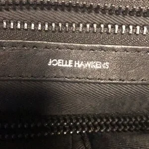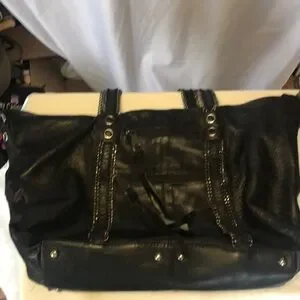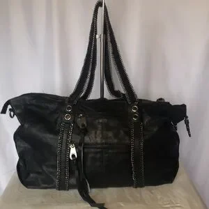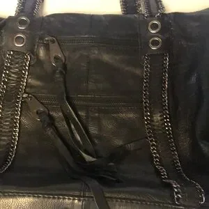JOELLE HAWKINS large black leather handbag. Bag has silver hardware. Chain links through straps and silver feet. This bag has some weight to her just a beautiful bag. Photos show where a part of the chain link on one strap has come loose. Price will reflect that flaw. Lots of room inside! Measures approximately 20 X 11 X 5 inches.