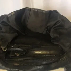 JOELLE HAWKINS large black genuine leather shoulder handbag. Silver hardware.
